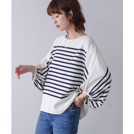 サテン生地が軽やかで涼しげなボーダートップス。大きく膨らんだ袖が気になる二の腕をカバーしつつ、ゆったり快適に過ごすことができます。ボーダーですがカジュアルすぎずきれいめ上品な印象なのでオフィスカジュアルにも◎