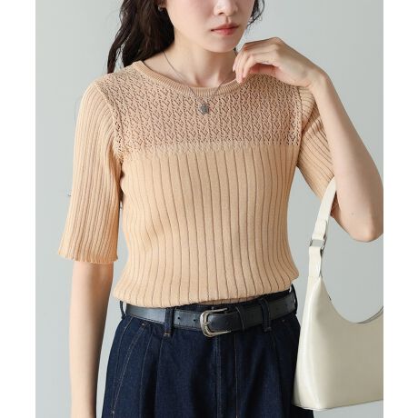 リブニットにシアー素材を切り替えた、シンプルながらも表情のある一枚。ほどよくフィットするシルエットと抜け感のある透けディテールで、女性らしさを引き立ててくれます。