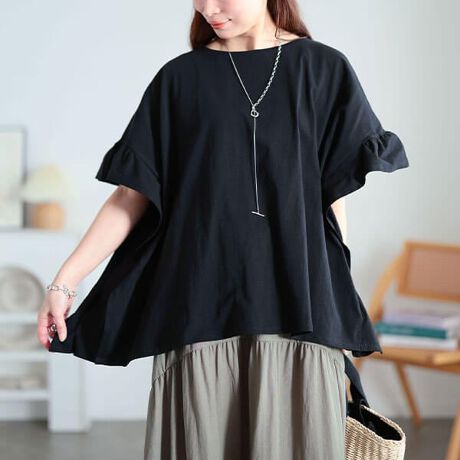 愛されゆるかわカジュアル☆フリルスリーブコットンワイドプルオーバー上半身をすっぽり包み込むワイドシルエットでこなれ感のある落ち感◎二の腕を華見せするフリルショルダーとラフなドロップショルダーで楽ちんな着心地なのもオススメポイント☆シンプルになりがちな夏コーデもインパクトのあるサイジングで簡単に印象チェンジ♪デイリーコーデに取り入れやすい大人可愛い一着です!