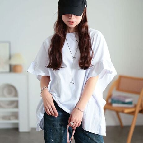 愛されゆるかわカジュアル☆フリルスリーブコットンワイドプルオーバー上半身をすっぽり包み込むワイドシルエットでこなれ感のある落ち感◎二の腕を華見せするフリルショルダーとラフなドロップショルダーで楽ちんな着心地なのもオススメポイント☆シンプルになりがちな夏コーデもインパクトのあるサイジングで簡単に印象チェンジ♪デイリーコーデに取り入れやすい大人可愛い一着です!