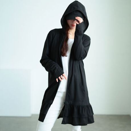 シンプルなラッシュガードに、フリルをあしらい女心くすぐる女性らしく愛らしいシルエットに落とし込んだ一着。使い勝手のいいブラックで甘さを抑えつつ、幅広い世代に馴染むアイテムに。フィンガーホール付きだから、手元までしっかり紫外線対策ができるのも嬉しいポイント。窮屈感なく、程よくゆったりとしたシルエットですっきり着られ、ヒップや太ももまで隠れる安心のチュニック丈なのも嬉しいポイント。裾のフリルがふわりと揺れ、シルエットに動きを加えます。フード付きで小顔効果にも。フルジップ仕様で着こなしの幅も広がります。