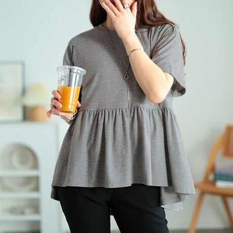 シンプルなTシャツを、女性らしいシルエットに落とし込んだ半袖カットソー。ふんわり上品に広がるペプラムシルエットが、シルエットに動きを加え、一枚でもサマ見えに。ロールアップ風の袖口デザインが、垢抜けた雰囲気をプラスします。女性らしいペプラムシルエットが、全体にメリハリをプラスし、高めの切り替え位置で脚長効果を発揮します。ふんわりとウエスト・腰・ヒップを包み込み、後ろ丈が長く設定されたデザインだから、気になるヒップもカバー。ゆったりなのに、すっきり見える、頼れる一着。