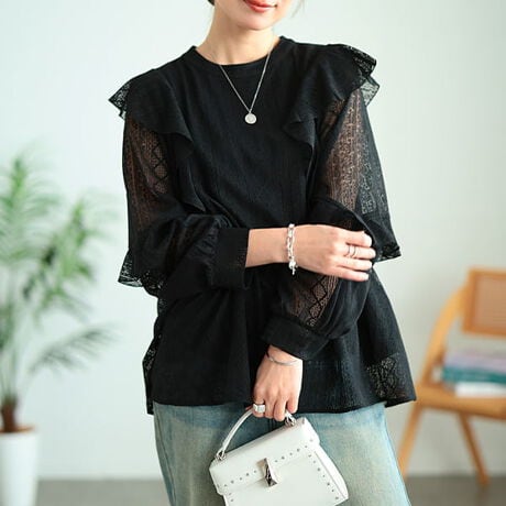 繊細なレースで仕立てた、存在感のあるレースブラウス。肩から縦にあしらったフリルが、甘さを添えながらもすっきりとした印象に見せてくれます。身幅や袖幅にゆとりのあるシルエットで、体のラインを拾いにくくリラックスした着心地♪身頃部分にはさらりとした裏地付きで、程よい透け感を楽しみながら安心して着用いただけます。