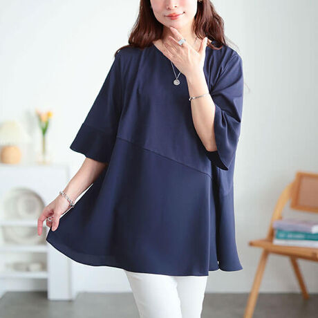 着ている間ずっと涼しい!持続性冷感斜め切り替えフレアチュニック汗の気化熱を利用してひんやり続く持続性冷感生地で快適着心地◎大胆な斜め異素材切り替えで視線を上げてスタイルアップ効果抜群!スッキリフレアシルエットで動きやすさと体型カバーを実現◎フレアスリーブで二の腕ラインを拾わずに華見せ効果も抜群です☆デイリー〜オフィスカジュアルにもオススメのシンプルデザインです♪