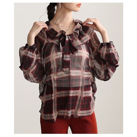 チェック柄にシフォンのフリルカラーを合わせたラグランブラウス。ふんわり軽やかなシルエットで、着るだけでコーデに華やかさをプラス。甘さと上品さを程よく楽しめる一枚です☆