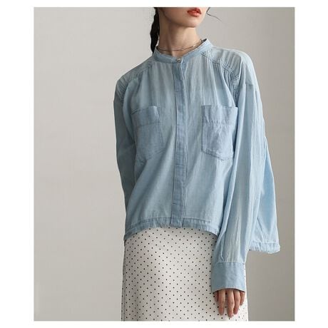 シアーデニム素材が軽やかな印象のギャザードロストシャツ。ドロストを絞ればシルエットに変化が生まれ、こなれた着こなしに。羽織としてもトップスとしても楽しめる一枚です☆