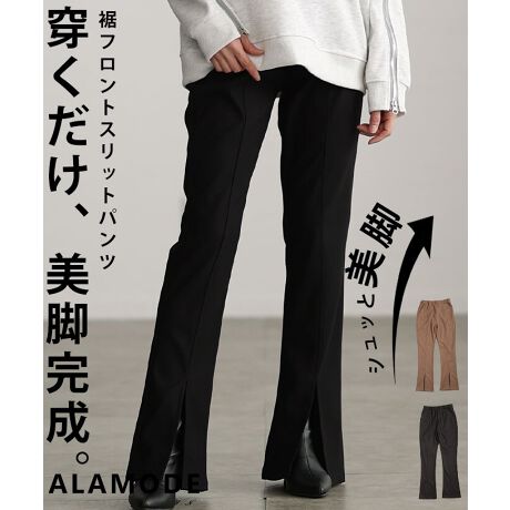 【パンツ】 スリット スリム ロング フレア ウエストゴム センターシーム 美脚 ブラック ベージュ