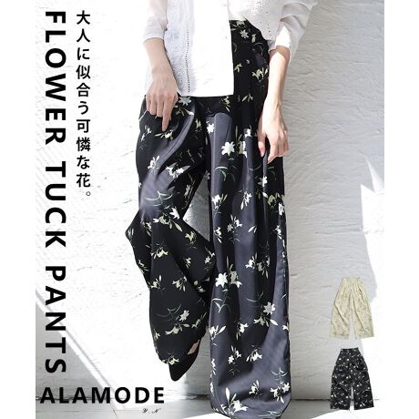フラワープリントが華やかなタックワイドパンツ。ふんわり広がるシルエットとタックの立体感で、穿くだけでこなれた印象に。シンプルなトップス合わせでも映える一本です☆