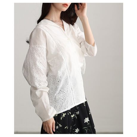 【トップス】 シャツ ブラウス レース パンチング 刺繍 オープンカラー 長袖 綿 オフホワイト 白