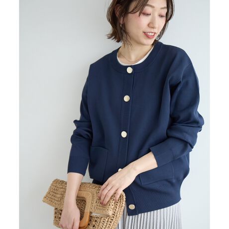 裾や袖口もフラットに仕上げ、ニットでありながらジャケット風の着こなしも楽しめます。