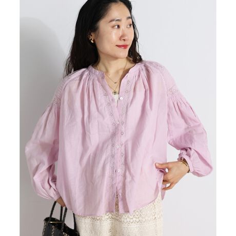やわらかなラベンダーカラーに、繊細なレースとピンタックをあしらった華やかなブラウス。