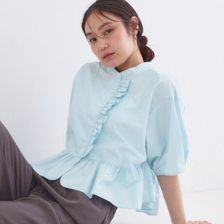 前立てに施したフリルデザインとペプラムシルエットで、品よく華やぐシャツブラウス