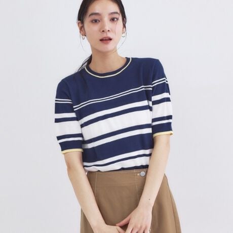 ランダムボーダーが鮮度あるハーフスリーブニット