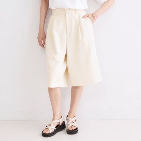 ・膝にかかるほどよいレングスで、カジュアルになりすぎず落ち着いた印象で着こなせるハーフパンツ。