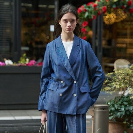 【光沢と落ち感のあるデニム生地で仕立て上げた品のあるダブルブレストジャケットが登場】