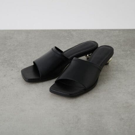 ゴールドのメタリックヒールが華やかなミュールサンダル。