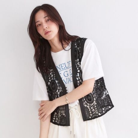 トレンドのレースアイテムをレイヤードで楽しめるレースベスト