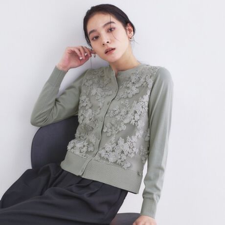 ・立体感のあるフラワーモチーフのチュールレースは、華やかでありつつもニットと同色なので、様々なコーディネートと合わせやすい一枚です。