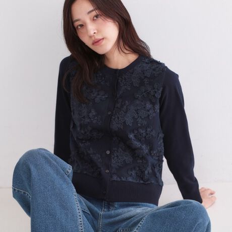 ・立体感のあるフラワーモチーフのチュールレースは、華やかでありつつもニットと同色なので、様々なコーディネートと合わせやすい一枚です。