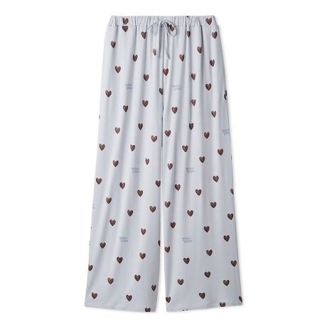 温かみのあるじんわり滲んだ手描き風のハート柄で、おうち時間を癒しのひとときに。「胸がきゅんとする」をコンセプトにデザインした、ハート柄のシリーズのロングパンツです。ハート柄に配色のロゴを効かせた、甘すぎない絵柄がポイント。ひんやりとした肌触りがお楽しみいただける、なめらかな接触冷感素材を使用しました。両サイドにポケット付きのストレートシルエットです。色はオフホワイト、ピンク、ブルーの3色展開。同シリーズのケーキワンポイントTシャツと合わせてお楽しみください。