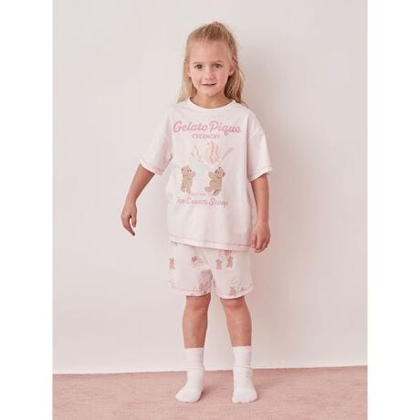 とろけるアイスクリームとベアをカラフル&ポップに描いた、ファミリーでお楽しみいただけるアイスクリームベアシリーズです。接触冷感を施した総柄プリントのKIDSショートパンツは、汗ばむ日にも涼しくはける1枚。大きなアイスクリームを運んだり、スプーンで美味しそうに食べている愛らしいベアの絵柄を、ロゴと組み合わせてキャッチーに散りばめました。裾に入れた配色ステッチでアクセントを効かせ、可愛い印象に仕上げています。色はクリームとピンクの2色展開。同シリーズのTシャツや雑貨と合わせるのもおすすめです。LADIES’、HOMME、BABYアイテムとリンク・コーディネートもお楽しみください。