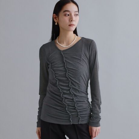 ・アシンメトリー状にピンタックとシャーリング使いを施したデザインカットソー。