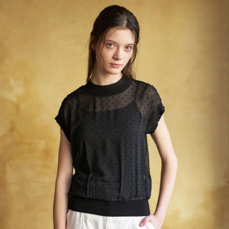 フェミニンなドットジャカード素材とカジュアルなリブディテールを組み合わせた、新作プルオーバーが登場しました。