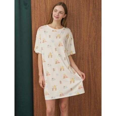 とろけるアイスクリームとベアをカラフル&ポップに描いた、ファミリーでお楽しみいただけるアイスクリームベアシリーズです。接触冷感加工を使用した総柄プリントのワンピースは、お風呂上がりなどに1枚でざっくりと着用いただけるビッグシルエット。丈が長すぎず、締め付け感もないので汗ばむ時期にぴったりの1枚です。大きなアイスクリームを運んだり、スプーンで美味しそうに食べている愛らしいベアの絵柄を、ロゴと組み合わせてキャッチーにプリント。袖や裾に入れた配色ステッチでアクセントを効かせ、可愛い印象に仕上げています。色はクリームとピンクの2色展開。同時期に展開するスムーズィーライトのグラデーションボーダーパーカとの組み合わせもおすすめです。HOMME、KIDS、BABYアイテムとリンク・コーディネートもお楽しみください。