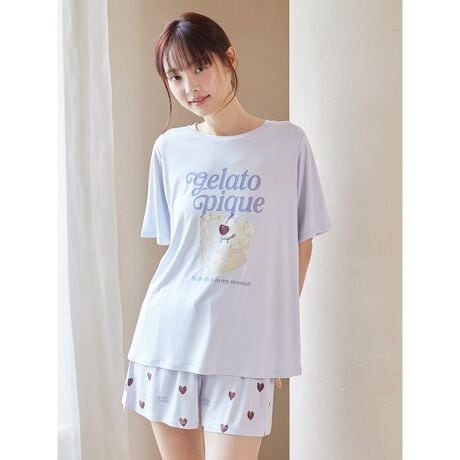 「胸がきゅんとする」をコンセプトにデザインした、ハート型のいちごショートケーキをプリントしたレーヨンTシャツです。ひんやりとした肌触りがお楽しみいただける、なめらかな接触冷感素材を使用。こっくりとした生クリームたっぷりを添えて、美味しそうに仕上げました。目を引くキャッチーなロゴがポイントです。デザインは、ケーキの下部に「胸きゅん」を意味する英語をプリントしています。色はオフホワイト、ピンク、ブルーの3色展開。同シリーズのハート柄ショートパンツと合わせたり、同時期に展開するスムーズィーネップカーディガンとのコーディネートもおすすめです。