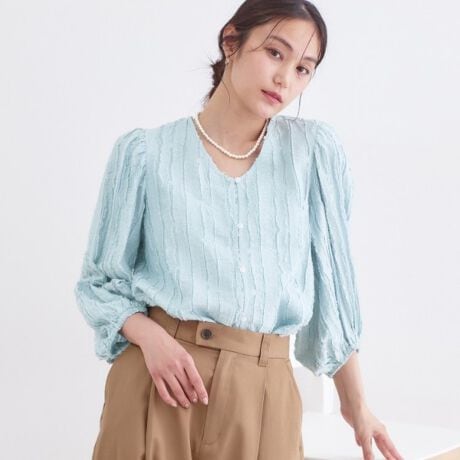 フリンジジャガードの華やかな素材を使用した、前開きブラウス