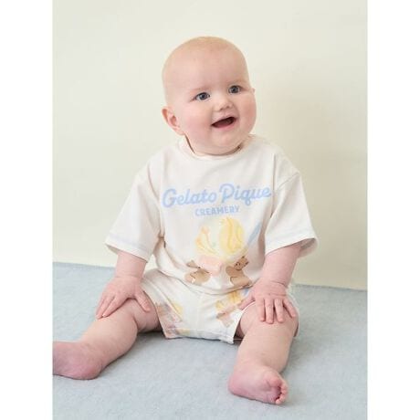とろけるアイスクリームとベアをカラフル&ポップに描いた、ファミリーでお楽しみいただけるアイスクリームベアシリーズです。接触冷感を施したBABYサイズのTシャツは、汗ばむ日にも着用しやすい1枚。夏らしい色合いの大きなアイスクリームを運ぶベアを、ロゴと組み合わせてキャッチーに描きました。肩にスナップボタン付きで着脱しやすいのもポイント。袖や裾に入れた配色ステッチでアクセントを効かせ、可愛い印象に仕上げています。色はクリームとピンクの2色展開。同シリーズのショートパンツやBABY雑貨と合わせたり、同時期に展開するスムーズィーライトのグラデーションボーダーポンチョとの組み合わせもおすすめです。LADIES’、HOMME、KIDSアイテムとリンク・コーディネートもお楽しみください。