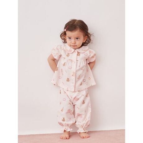 夏の楽しいお泊まり会にも映える、サッカー素材を使用したパジャマパーティーシリーズです。ベアのぬいぐるみやお菓子など、パジャマパーティーにちなんだ絵柄をにぎやかに散りばめた総柄プリントのBABYロングパンツ。ウエストに小さなフリルを添え、裾はシャーリングを入れることで可愛らしさと引きずりにくさを両立しました。左腰に入れたロゴ刺繍と、裾にあしらった可憐なピコレースもポイントです。同シリーズのシャツやTシャツ、巾着バッグと合わせて、夏の旅行やお泊まり会にもおすすめ。KIDSサイズときょうだいでコーディネートもお楽しみいただけます。