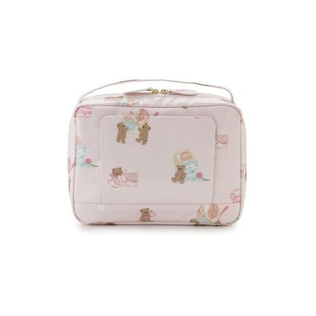 とろけるアイスクリームとベアをカラフル&ポップに描いた、ファミリーでお楽しみいただけるアイスクリームベアシリーズ。大きなアイスクリームを運んだり、スプーンで美味しそうに食べている愛らしいベアの絵柄を、ロゴと組み合わせてキャッチーに散りばめたおむつポーチです。ダブルジップで開閉しやすい、Lサイズのおむつが6枚入るスクエア型のポーチ。フックに掛けられるハンドル付きで、外出先や宿泊先などでも使いやすいデザインです。外側ポケットにはウェットティッシュも収納可。表地のコットンは水や摩擦に強い加工を施し、裏地は抗菌防臭機能が付いた生地を使用しました。色はクリームとピンクの2色展開。同シリーズのママバッグと合わせたり、お揃いの柄のKIDS、BABYアイテムとリンク・コーディネートもお楽しみいただけます。