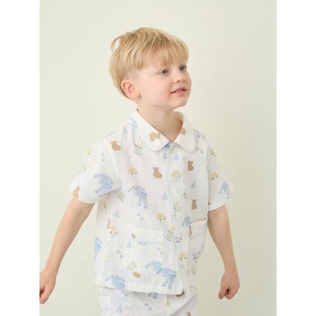 夏の楽しいお泊まり会にも映える、サッカー素材を使用したパジャマパーティーシリーズです。車のオモチャやお菓子など、パジャマパーティにちなんだ絵柄をにぎやかに散りばめた総柄プリントのKIDSシャツ。爽やかなブルーのパイピングと、左右のポケットがおしゃれな1枚です。裾の内側には、お腹が捲れないように同柄のロングパンツを留められるボタンも付けました。左ポケットにワンポイントでロゴ刺繍入りです。同シリーズのロングパンツや巾着バッグと合わせて、夏の旅行やお泊まり会にもおすすめ。BABYサイズときょうだいでコーディネートもお楽しみいただけます。