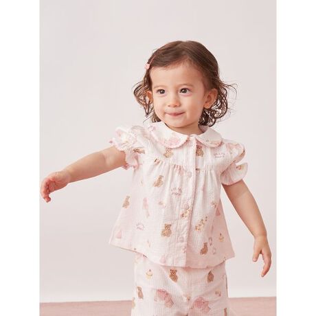 夏の楽しいお泊まり会にも映える、サッカー素材を使用したパジャマパーティーシリーズです。ベアのぬいぐるみやお菓子など、パジャマパーティにちなんだ絵柄をにぎやかに散りばめた総柄プリントのBABYシャツ。胸元で切り替えたふんわりシルエットに、袖口のシャーリング、大きな丸襟などキュートなディテールを詰め込みました。左裾にワンポイントで入れたロゴ刺繍や、前立てや襟元にあしらった可憐なピコレースもポイントです。同シリーズのロングパンツや巾着バッグと合わせて、夏の旅行やお泊まり会にもおすすめ。KIDSサイズときょうだいでコーディネートもお楽しみいただけます。