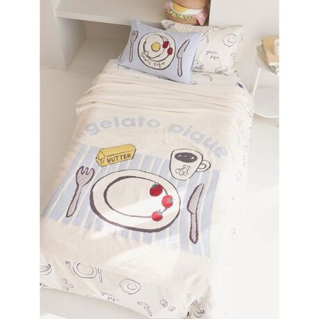 毎日の目覚めと朝ごはんが楽しみになりそうな、遊び心たっぷりの寝具シリーズです。モーニングのテーブルコーディネートをジャガードで表現したマルチカバー。ふんわり柔らかな素材感で、爽やかなカラーリングがインテリアにアクセントをもたらします。同シリーズのピローケースや寝具セットとのコーディネートも可能。白いお皿の部分に同シリーズのベーグルサンドのお昼寝クッションを乗せれば、可愛い朝ごはんが完成します。