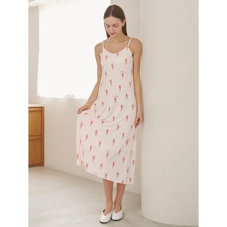 猛暑の夏をちょっぴり涼しくHAPPYに彩る、冷たいソルベをモチーフにした接触冷感のレーヨンシリーズです。レモン、ストロベリー、ソルティーブルーの3つのフレーバーをおいしそうに描いた、総柄プリントのキャミワンピース。ひんやりした肌触りのなめらかな素材感で、取り外し可能なカップと膝丈の裏地も付けました。切り替えのないシンプルなシルエットで、単体でも重ね着しても着用しやすい1枚です。お気に入りのソルベショップでフレーバーやトッピングを選ぶような、心ときめくひとときをお楽しみください。色はイエロー、ピンク、ブルーの3色展開。同時期に展開するスムーズィー2BDシリーズとコーディネートするのもおすすめです。