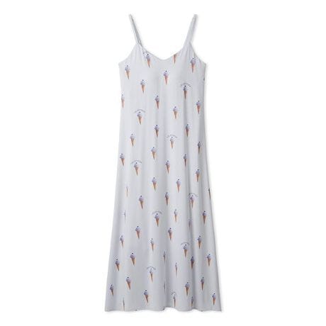 猛暑の夏をちょっぴり涼しくHAPPYに彩る、冷たいソルベをモチーフにした接触冷感のレーヨンシリーズです。レモン、ストロベリー、ソルティーブルーの3つのフレーバーをおいしそうに描いた、総柄プリントのキャミワンピース。ひんやりした肌触りのなめらかな素材感で、取り外し可能なカップと膝丈の裏地も付けました。切り替えのないシンプルなシルエットで、単体でも重ね着しても着用しやすい1枚です。お気に入りのソルベショップでフレーバーやトッピングを選ぶような、心ときめくひとときをお楽しみください。色はイエロー、ピンク、ブルーの3色展開。同時期に展開するスムーズィー2BDシリーズとコーディネートするのもおすすめです。