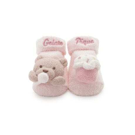 とろけるアイスクリームとベアをカラフル&ポップにデザインした、アイスクリームベアのBABY雑貨シリーズです。カラフルなトッピングを乗せたカップアイスと、アイスを美味しそうに食べるベアを立体的にあしらったBABYサイズのソックス。なめらかな肌触りの'スムーズィー'を使用し、夏の足元に似合う涼しげなカラーリングで仕上げました。折り返し部分にロゴ刺繍を入れ、足裏には滑り止めも付いています。色はミントとピンクの2色展開。同シリーズのルームウェアや雑貨と組み合わせて、ギフトにもおすすめです。