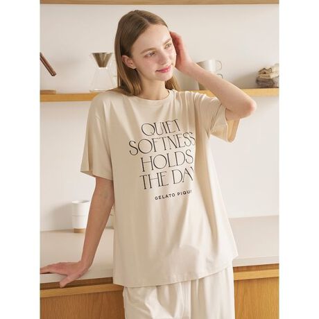 夏にうれしい接触冷感の機能を備えた、肌触りなめらかなレーヨン素材を使用した半袖Tシャツです。落ち着いた色合いのボディに、「静かな柔らかさが1日を包む」という意味のメッセージロゴを大きくプリント。裾にかけて程良くフレアを入れ、ゆったりと着用いただけるシルエットに仕上げています。色は優しいベージュと、落ち着いたダークグレーの2色展開。同シリーズのショートパンツやロングパンツを合わせてお楽しみください。