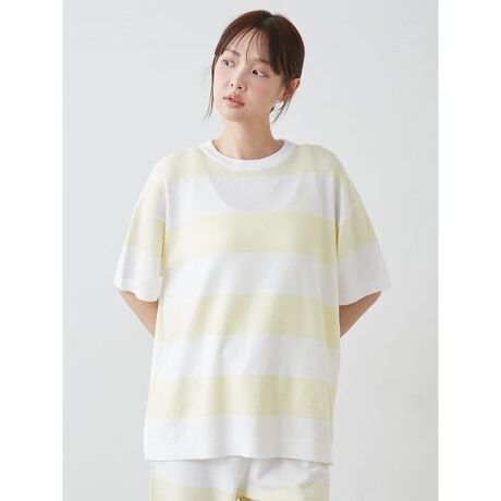 なめらかな肌触りの’スムーズィーライト’素材を使用した、gelato piqueの定番2色ボーダーシリーズです。コントラストの効いた、夏らしいフレッシュな配色が魅力の半袖プルオーバー。左の腰元にさりげなくロゴ刺繍を入れ、リラックスして着用いただけるサイズ感で仕上げました。色はレモンを思わせるイエロー、ストロベリーをイメージしたピンク、ブルーベリーのようなブルーの3色展開。同シリーズのボトムと組み合わせたり、同時期に展開するソルベ柄シリーズとのコーディネートもおすすめです。