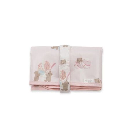 とろけるアイスクリームとベアをカラフル&ポップに描いた、ファミリーでお楽しみいただけるアイスクリームベアシリーズ。大きなアイスクリームを運んだり、スプーンで美味しそうに食べている愛らしいベアの絵柄を、ロゴと組み合わせてキャッチーに散りばめたおむつシートです。外出先でさっと広げて使えるシートは、1枚あると様々なシーンで重宝。コンパクトに折り畳んでベルトで留められるのでバッグに入れやすく、汚れてもさっと拭き取れるのが便利です。表地のコットンは水や摩擦に強い加工を施し、裏地は抗菌防臭機能が付いた生地を使用しました。色はクリームとピンクの2色展開。同シリーズのママバッグと合わせたり、お揃いの柄のKIDS、BABYアイテムとリンク・コーディネートもお楽しみいただけます。