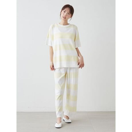 なめらかな肌触りの’スムーズィーライト’素材を使用した、gelato piqueの定番2色ボーダーシリーズです。コントラストの効いた、夏らしいフレッシュな配色が魅力のロングパンツ。腰元にロゴ刺繍入り、右後ろにポケットを付け、ゆったりとはける定番のストレートシルエットで仕上げました。色はレモンを思わせるイエロー、ストロベリーをイメージしたピンク、ブルーベリーのようなブルーの3色展開。同シリーズのトップスと組み合わせたり、同時期に展開するソルベ柄シリーズとのコーディネートもおすすめです。