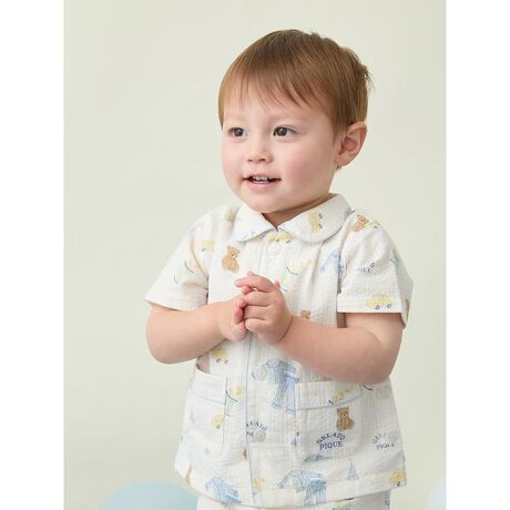 夏の楽しいお泊まり会にも映える、サッカー素材を使用したパジャマパーティーシリーズです。車のオモチャやお菓子など、パジャマパーティにちなんだ絵柄をにぎやかに散りばめた総柄プリントのBABYシャツ。爽やかなブルーのパイピングと、左右のポケットがおしゃれな1枚です。裾の内側には、お腹が捲れないように同柄のロングパンツを留められるボタンも付けました。左ポケットにワンポイントでロゴ刺繍入りです。同シリーズのロングパンツや巾着バッグと合わせて、夏の旅行やお泊まり会にもおすすめ。KIDSサイズときょうだいでコーディネートもお楽しみいただけます。