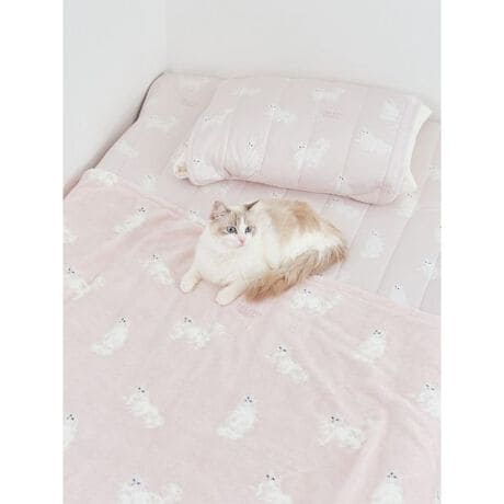 色んなポーズをしたもふもふの白猫をランダムに散りばめた、愛くるしいCAT柄の寝具シリーズです。毛羽部分はコットン100%でふっくら優しい肌触りの毛布は、夏のエアコンが効いた室内でのお休みにもちょうど良い1枚。抗菌防臭機能を備えた中綿を使用しています。通年でご使用いただける素材感なので、ギフトにもおすすめです。同シリーズのケットやピローパッドとのコーディネートもおすすめです。