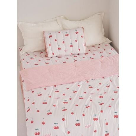 可愛いチェリーとクールなブルーベリーのモチーフを、夏らしくみずみずしいタッチで描いたフルーツ柄の寝具シリーズ。もちもちとした心地良い感触と、汗ばむ時期にうれしい機能を両立したリバーシブルケットです。フルーツを総柄プリントした表面は、ひんやり冷たい肌触りの接触冷感加工。裏面は柔らかな肌触りのパイル生地を使用し、中綿に抗菌防臭加工も施しました。気温の変化に合わせて、お好みの面を選んでご使用ください。色はピンクとブルーの2色展開。同シリーズの寝具やルームウェアとコーディネートしてお楽しみください。