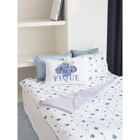 可愛いチェリーとクールなブルーベリーのモチーフを、夏らしくみずみずしいタッチで描いたフルーツ柄の寝具シリーズ。もちもちとした心地良い感触と、汗ばむ時期にうれしい機能を両立したリバーシブルケットです。フルーツを総柄プリントした表面は、ひんやり冷たい肌触りの接触冷感加工。裏面は柔らかな肌触りのパイル生地を使用し、中綿に抗菌防臭加工も施しました。気温の変化に合わせて、お好みの面を選んでご使用ください。色はピンクとブルーの2色展開。同シリーズの寝具やルームウェアとコーディネートしてお楽しみください。