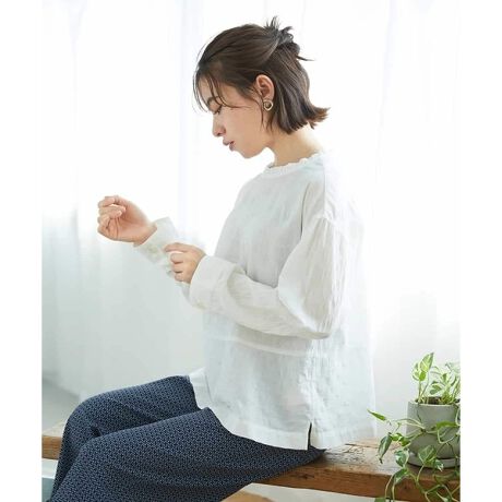 一枚で着映えするデザインなので、シンプルなパンツやスカートと合わせるだけでコーディネートが完成します。軽やかな素材感とほどよいデザイン性で、カジュアルからきれいめまで幅広いスタイリングに活躍します。首元のフリルスタンドカラーがさりげないアクセントで、アクセサリーがなくても華やかな印象に。一枚で涼しく、着心地よく、春夏のお出かけに重宝するブラウスです。同素材の前開きブラウス【NHBGD32330】もございます。