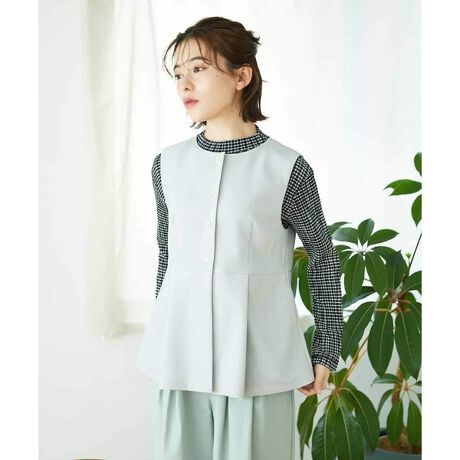 すっきりとしたノーカラーのシンプルデザインのジレ。カジュアルにもきれいめにも合わせやすい一枚。ハイウエストの切り替えとタックの入ったペプラムがフェミニンな印象と上品な雰囲気を演出してくれます。パールのようなボタンがデザインポイントにもなり、かしこまったシーンやセレモニーなどにも着回していただけるアイテムです。デニムなどに合わせてこなれた大人カジュアルスタイルなどオンオフ問わずに活躍します。同素材のパンツ【NHLGF88190】とセットアップスタイルも楽しめます。