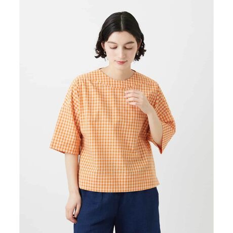 テキスタイルが可愛いチェック柄の素材を使用したゆったりショート丈のプルオーバーブラウス。たっぷりの身幅にドロップショルダーのデザインは楽ちんな着心地。暑い時期には快適にお召しいただけます。袖口はターンアップ可能なお仕立てですので、お袖を少し短く出来ます。衿ぐりはコンパクトなクルーネックですっきり。衿ぐりは後ろファスナー明きです。シンプルな着こなしの際にも存在感があり、コーデが決まる一枚です。